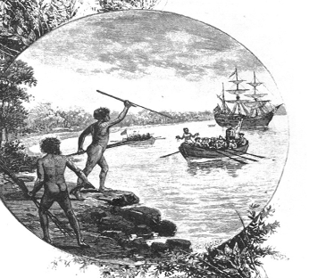 Image: A 19th-century engraving showing natives of the Gweagal tribe (Eora Nation) opposing the arrival of Captain James Cook in 1770.